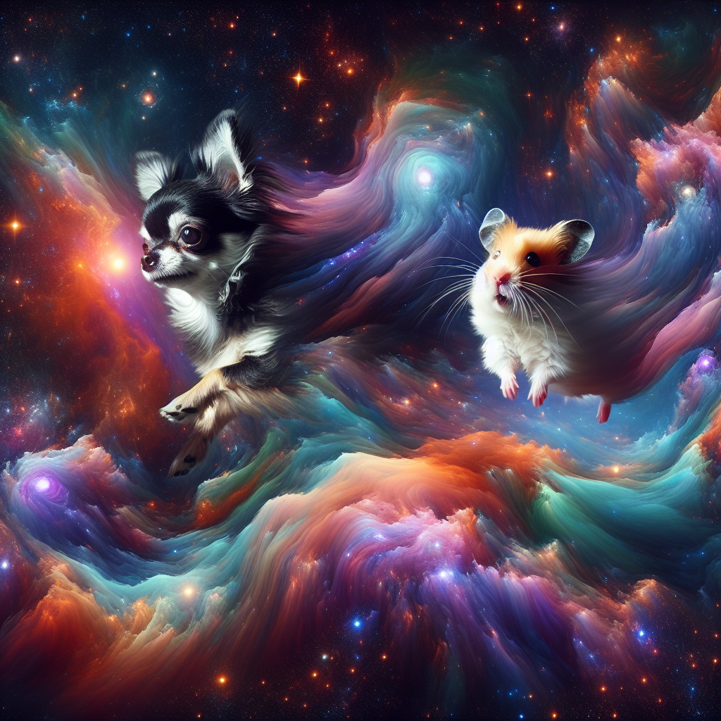 Create: Small black chihuahua and a small White hamster flying through space . Style: abstract expressionist style with flowing colors and forms. High quality digital illustration with vibrant colors.